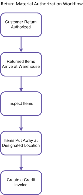 You can manage items that customers return. The diagram that follows shows a sample workflow for managing the return of an item from a sales order.