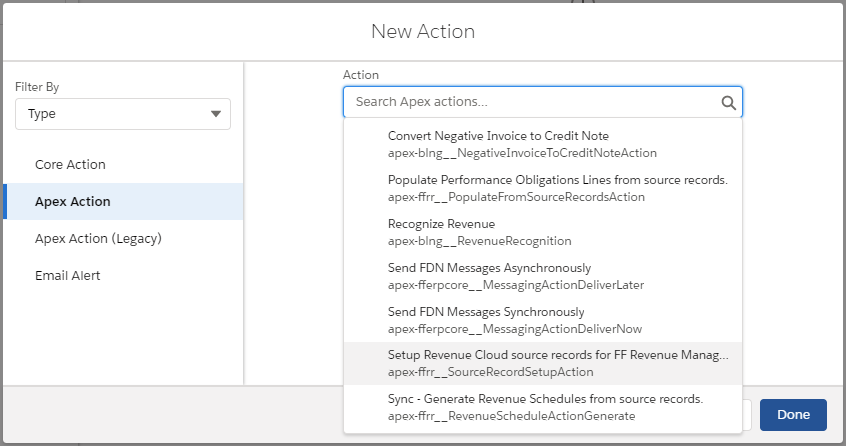 - In the New Action window, choose to Filter By "Type" then "Apex Action".