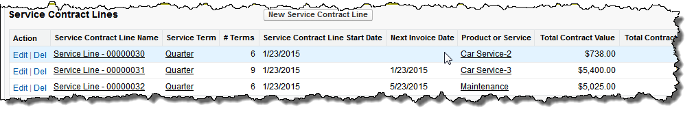 The Car Service-2 line appears on the invoice because the Service Contract Line Start Date is January 23rd and the Next Invoice Date Field is empty. The Car Service-3 line appears on the invoice because the Next Invoice Date is January 23rd. The Maintenance line does not appear because it is not due to be billed until May 23rd.