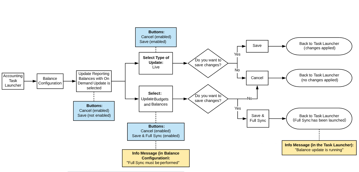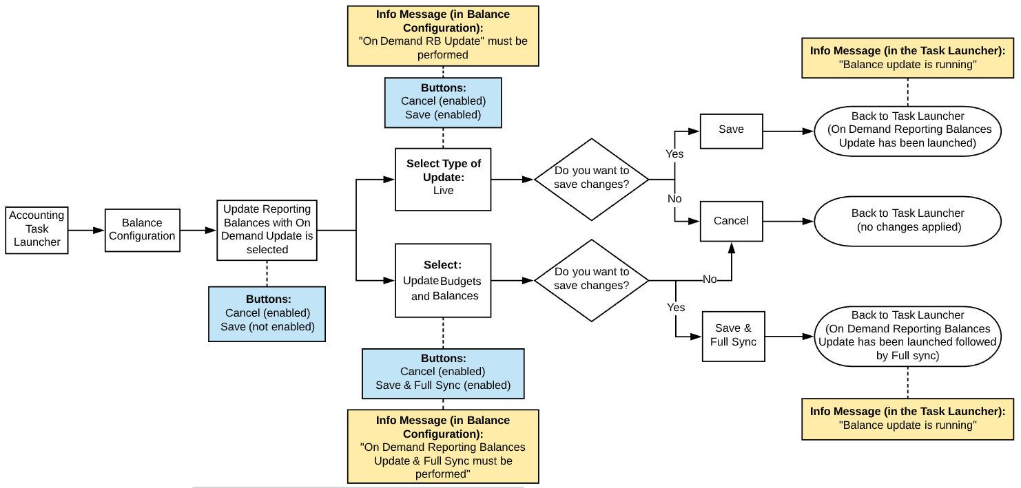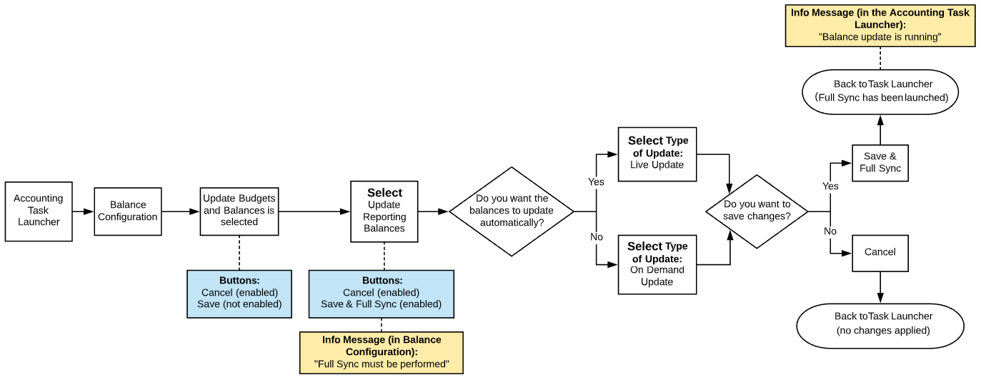 The following illustrations summarize the work flow required to switch your primary balance update when you use the Accounting Task Launcher and the work flow you select depends on your current update mode and the switch you wish to make. The following information is displayed: