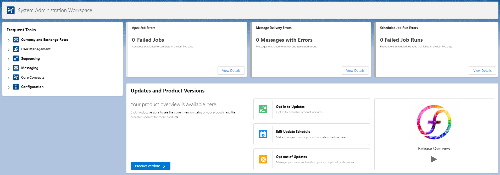 The System Administration workspace acts as a starting point for the activities that you conduct in your Certinia system administration role. Information and alerts are provided to assist with managing your org.