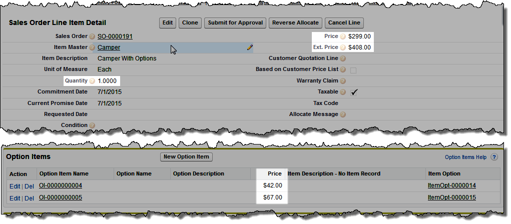 The Option Items related list on a sales order line shows the options that have been configured on the line.