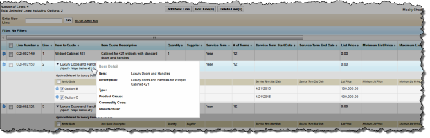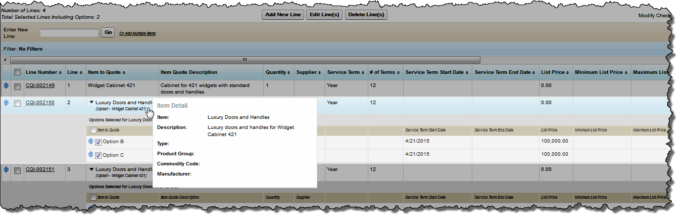 When you add an items that contains upsell items, these are shown in the customer quotation line depending on the options your administrator has set and the way in which the item master has been configured.