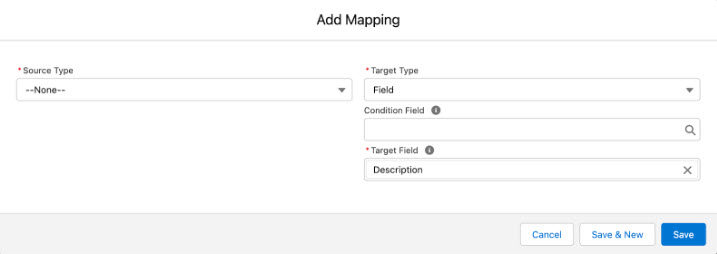 - Create a new mapping with a source type of None and a target field of Description. This will override the managed mapping and prevent ‘data value too large’ errors.