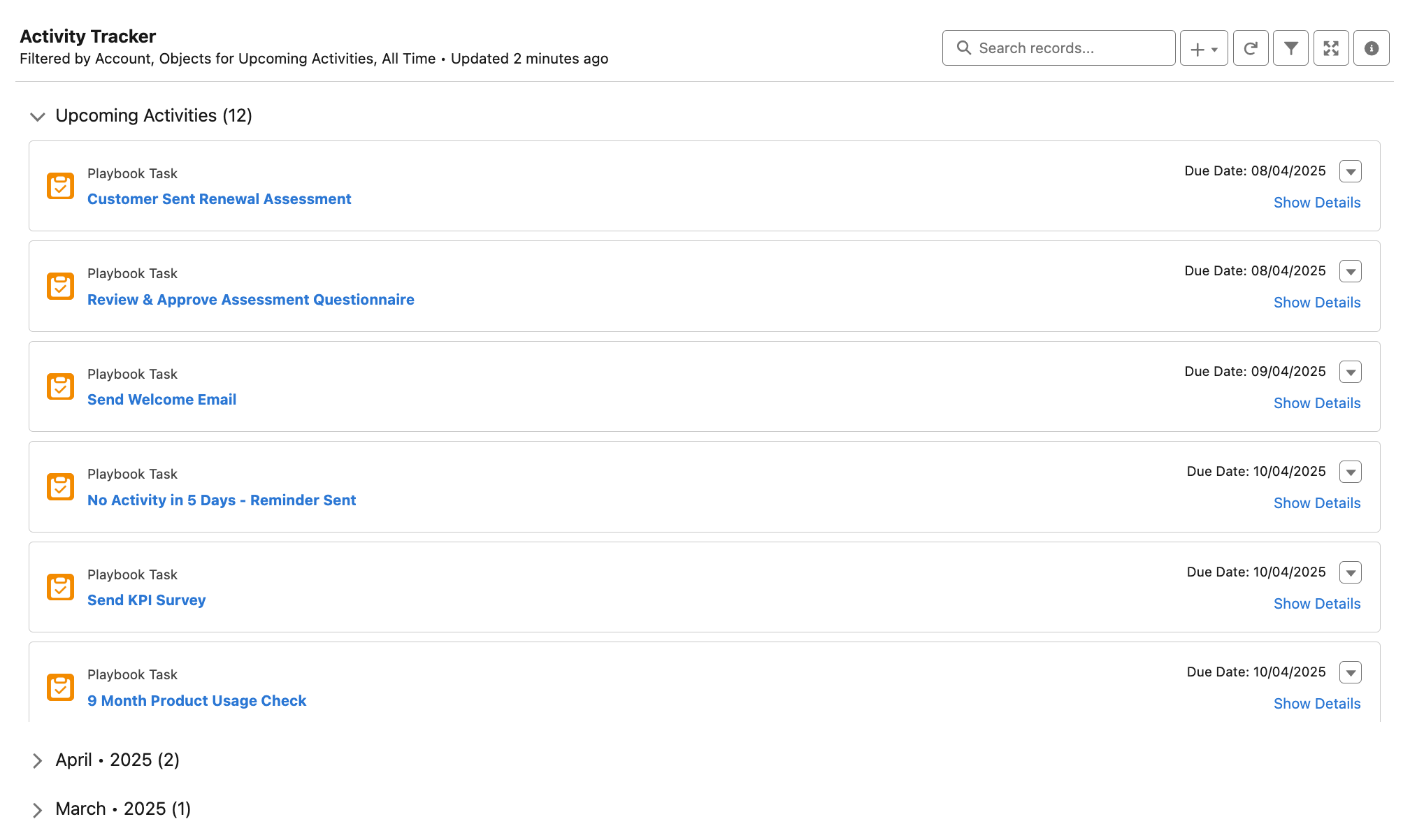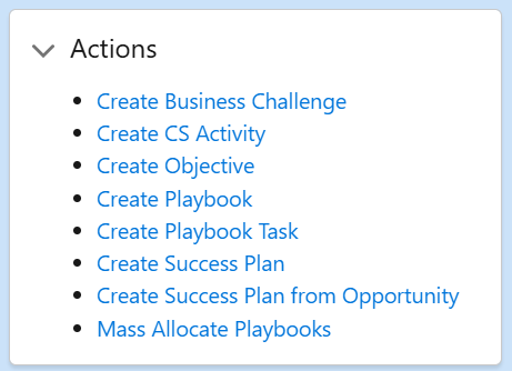 KPI cards provide you with information to highlight important details about your playbooks, objectives, success plans and tasks. To display a list of detailed records specific to each card, click the blue title link.