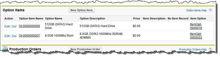 The Option Items related list on a sales order line shows the options that have been configured on the line.