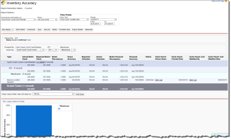 The Inventory Accuracy report enables you to evaluate the accuracy of the record of inventory in your warehouses against cycle counts.