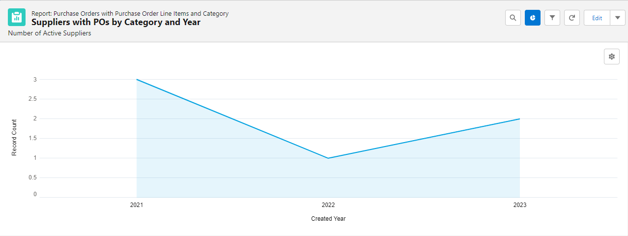 The Suppliers with POs by Category and Year report helps you track the total number of purchase orders per year, as well as their category and supplier site.