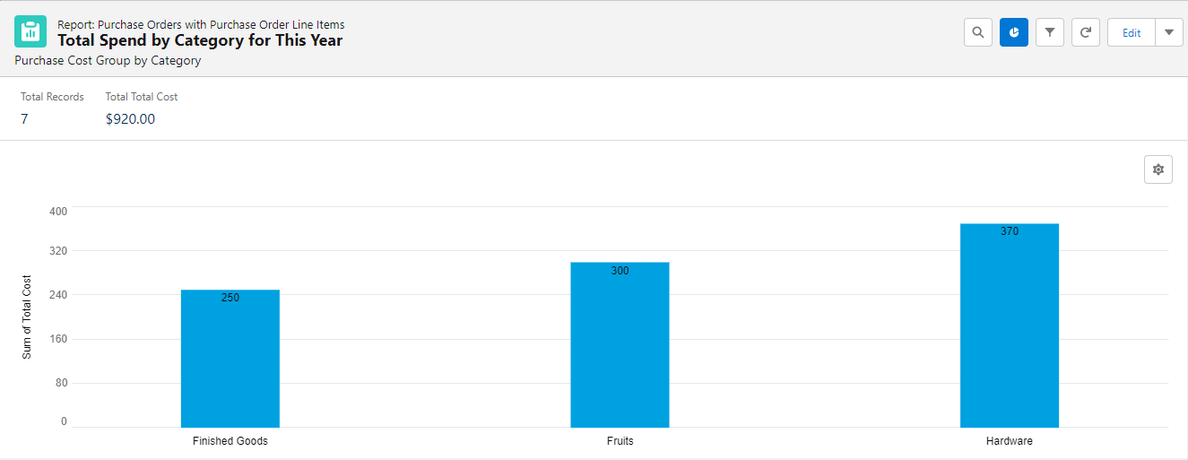 The Total Spend by Category for This Year report helps you track the total cost of all purchase orders per category within this calendar year.