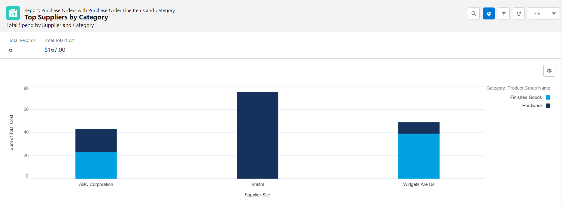 The Top Suppliers by Category for This Year report helps you track the total cost of all purchase orders and their category per supplier site within this calendar year.