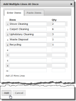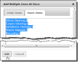 - On the customer quotation, click Add Multiple Items. Select Paste Items from the drop-down list. The Paste Items window displays.