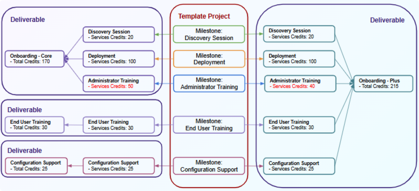 - When your services credits deliverables are set up, you can add them to any project. So, if one of your customers requests the Onboarding - Core Package and also wants the Configuration Support service, you can add those two deliverables to the project. See the image below: