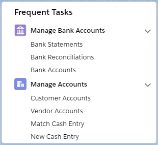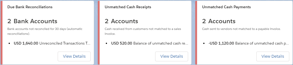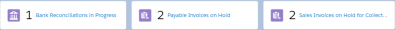 | Due Bank Reconciliations | The count of bank accounts not reconciled for 30 days or more. | Displays a list view of bank accounts not reconciled for 30 days or more. |