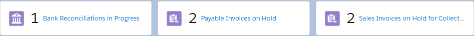 Your administrator can customize the Bank Reconciliations in Progress, Payable Invoices on Hold, Sales Invoices on Hold for Collections count cards using the Lightning App Builder, for more information, see Setting up Certinia Count Cards .