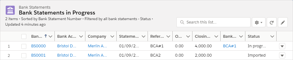 The Bank Statements view displays a list of bank statements with the status "Bank Statements in Progress".