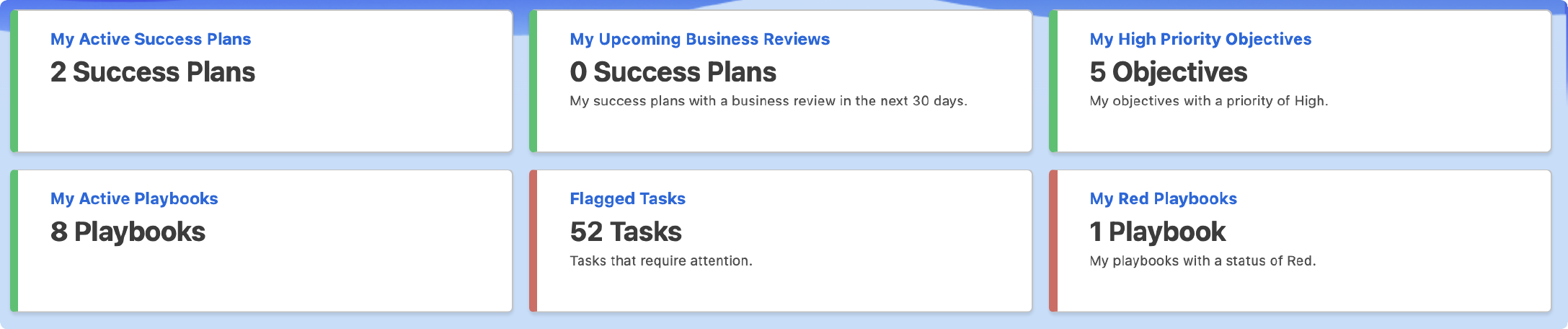 KPI cards provide you with information to highlight important details about your playbooks, objectives, success plans and tasks. To display a list of detailed records specific to each card, click the blue title link.