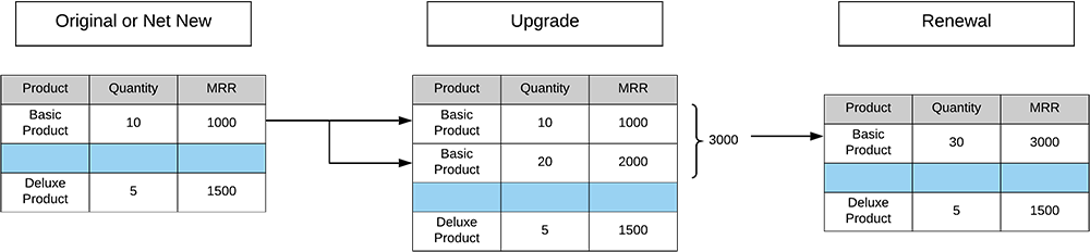 If an upgraded contract with two or more contract lines for the same product is renewed, the contract line with the higher MRR value is calculated as "Renewed" and mapped to the next contract line.