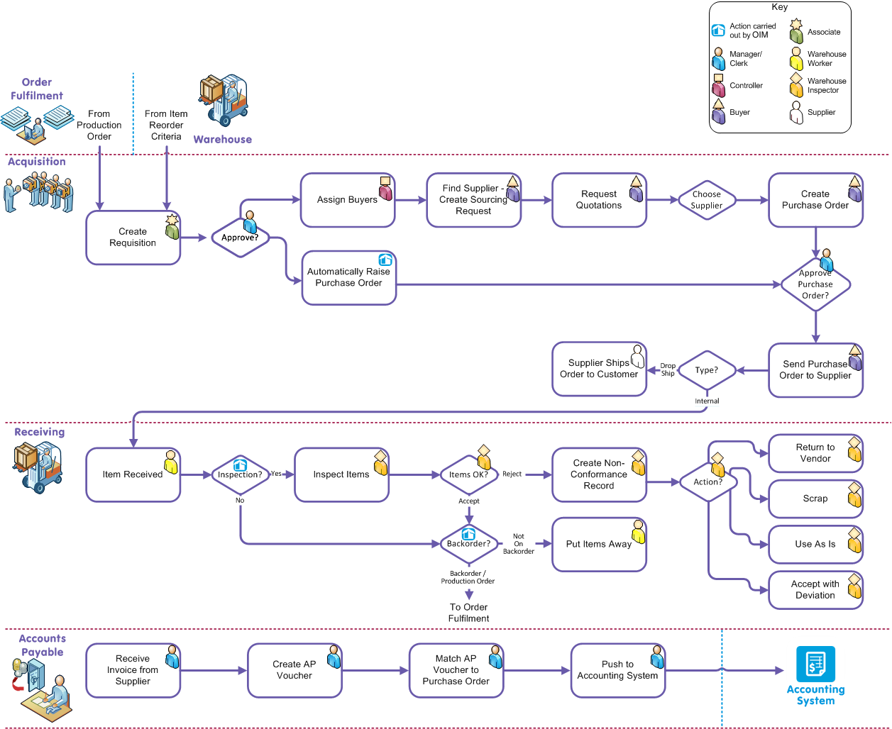 A request to buy something. to a purchase order and generation of the accounts payable invoice to be sent to the accounting system.