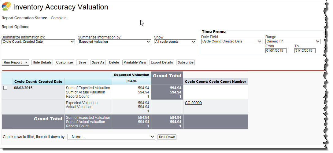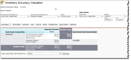 The Inventory Accuracy Valuation report shows the expected and actual valuations for each cycle count.