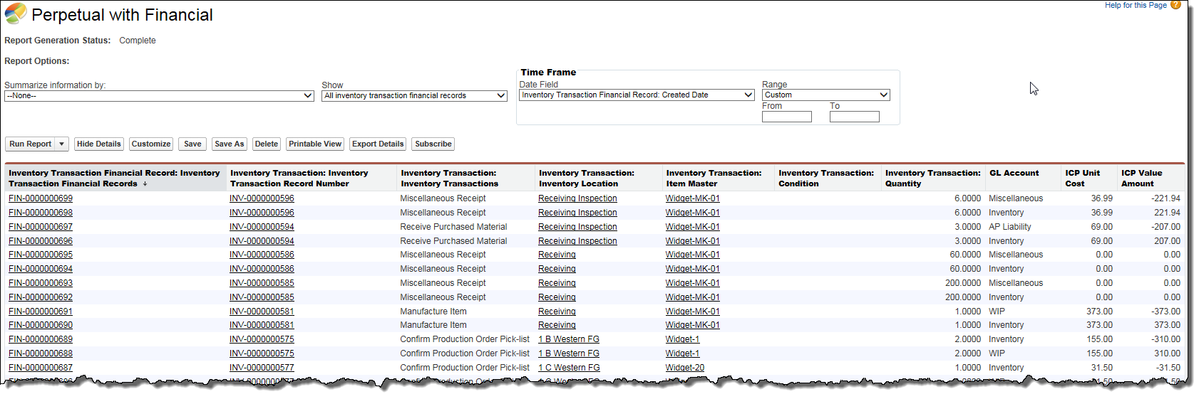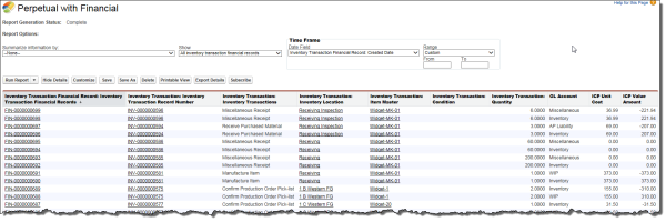 The Perpetual with Financial report lists the Inventory Transaction Financial Records and the Inventory Transaction Perpetual Records to which they relate. This report includes transaction and financial information such as: