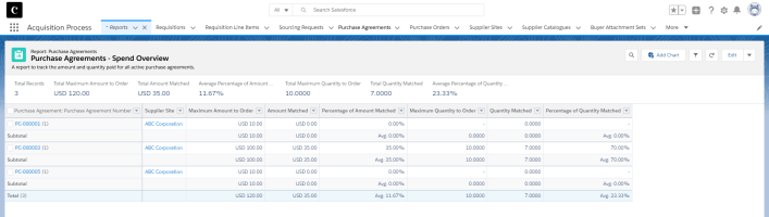 The Spend Overview report enables you to track the maximum amount and quantity to order for your approved purchase agreements and the amount and quantity paid for your active purchase agreements.