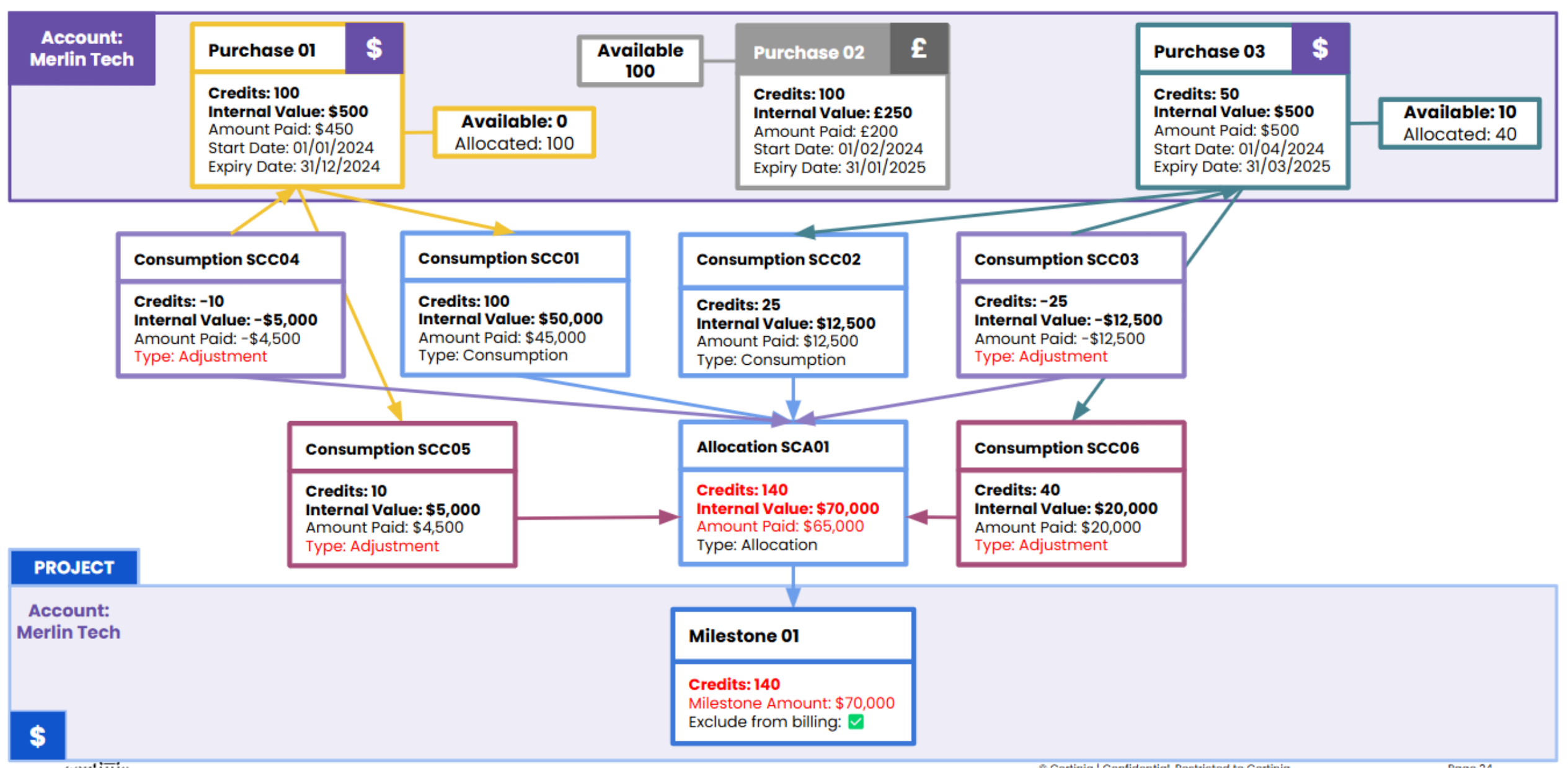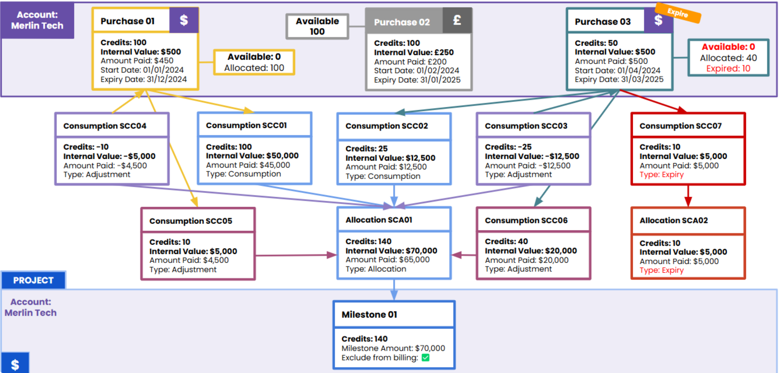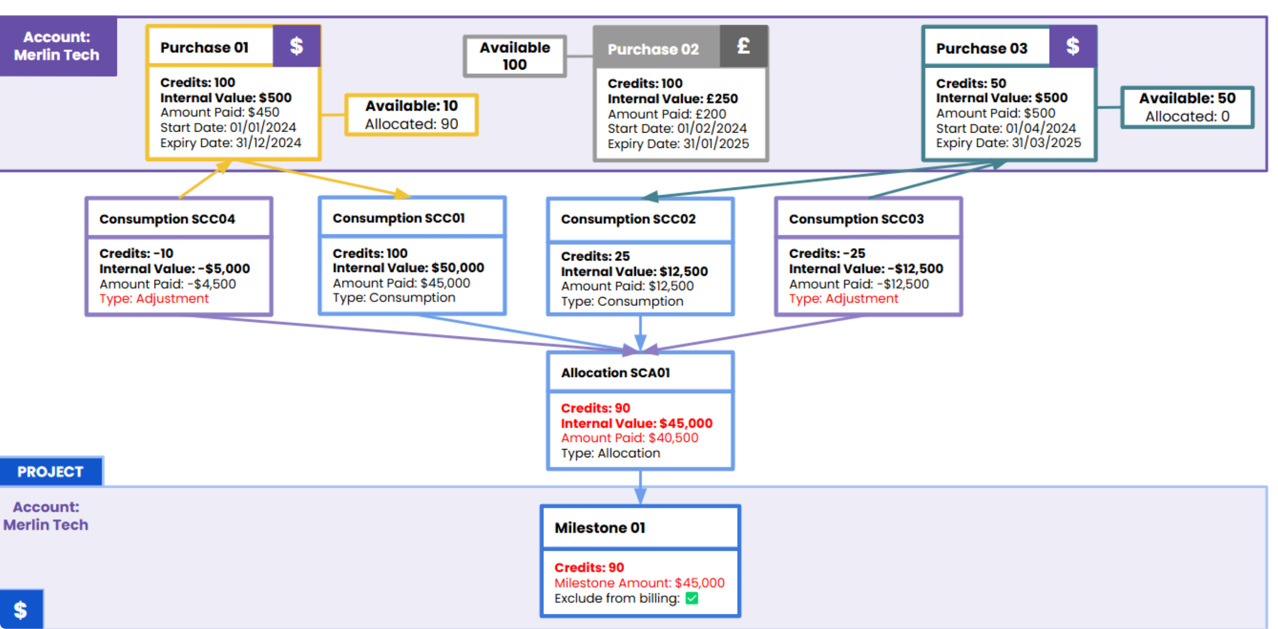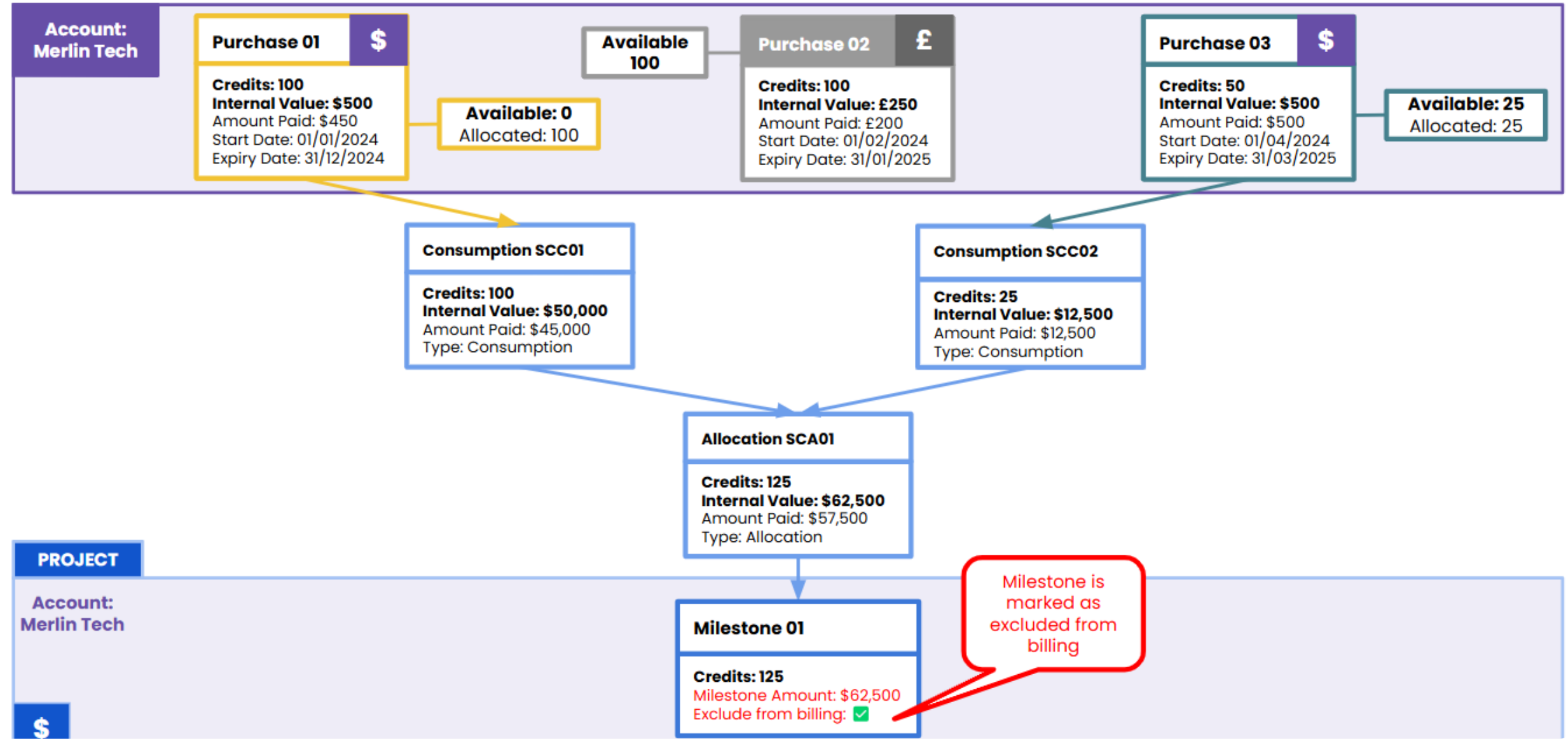 You allocate 125 services credits to Milestone 01, the credits are consumed from the Purchase 01 record because it has the earliest expiry date and it is in USD which is the same currency as that of the project. The remaining 25 services credits are consumed from Purchase 03. Services credits consumption records SCC01 and SCC02 of Consumption Type "Consumption", and allocation record SCA01 of Allocation Type "Allocation" are then generated. After the allocation the milestone is excluded from billing. See the image below: