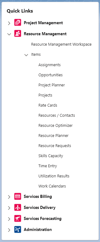 The Resource Management links enable you to navigate to the most frequently accessed pages that are relevant to your role.