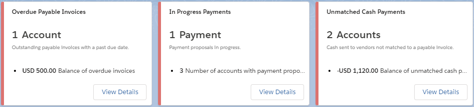 Alerts provide you with KPI information to highlight important details about your overdue invoices, payments in progress and unmatched cash payments. To display a list of detailed records specific to each alert, click View Details.
