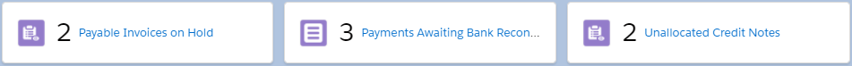 Your administrator can customize the Payable Invoices on Hold, Payments Awaiting Bank Reconciliation, Unallocated Credit Notes count cards using the Lightning App Builder, for more information, see Setting up Certinia Count Cards .
