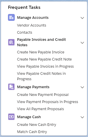 Counts summarize the number of records found on corresponding list views that are relevant for the Accounts Payable workspace. Counts enable you to quickly access related content. To display a list of detailed records specific to each count, click the count.