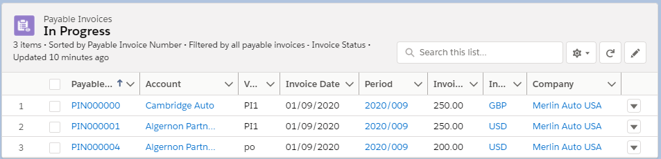 The Payable Invoices view displays a list of invoices with the status "In Progress".