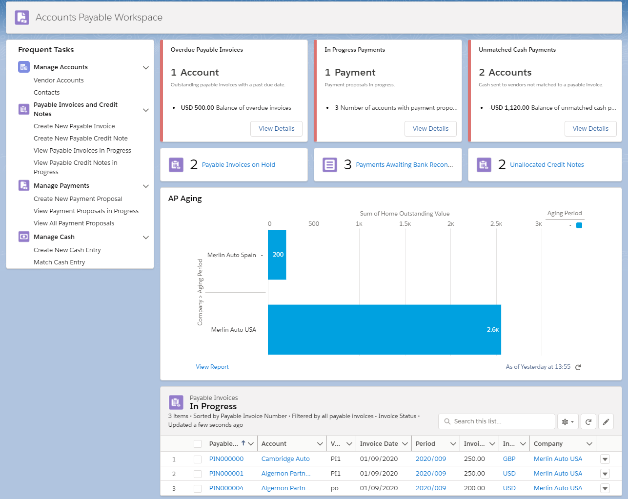 The Accounts Payable workspace acts as a starting point for the activities that you conduct in your AP clerk role. The summary information available is filtered to display only for the selected company or companies.