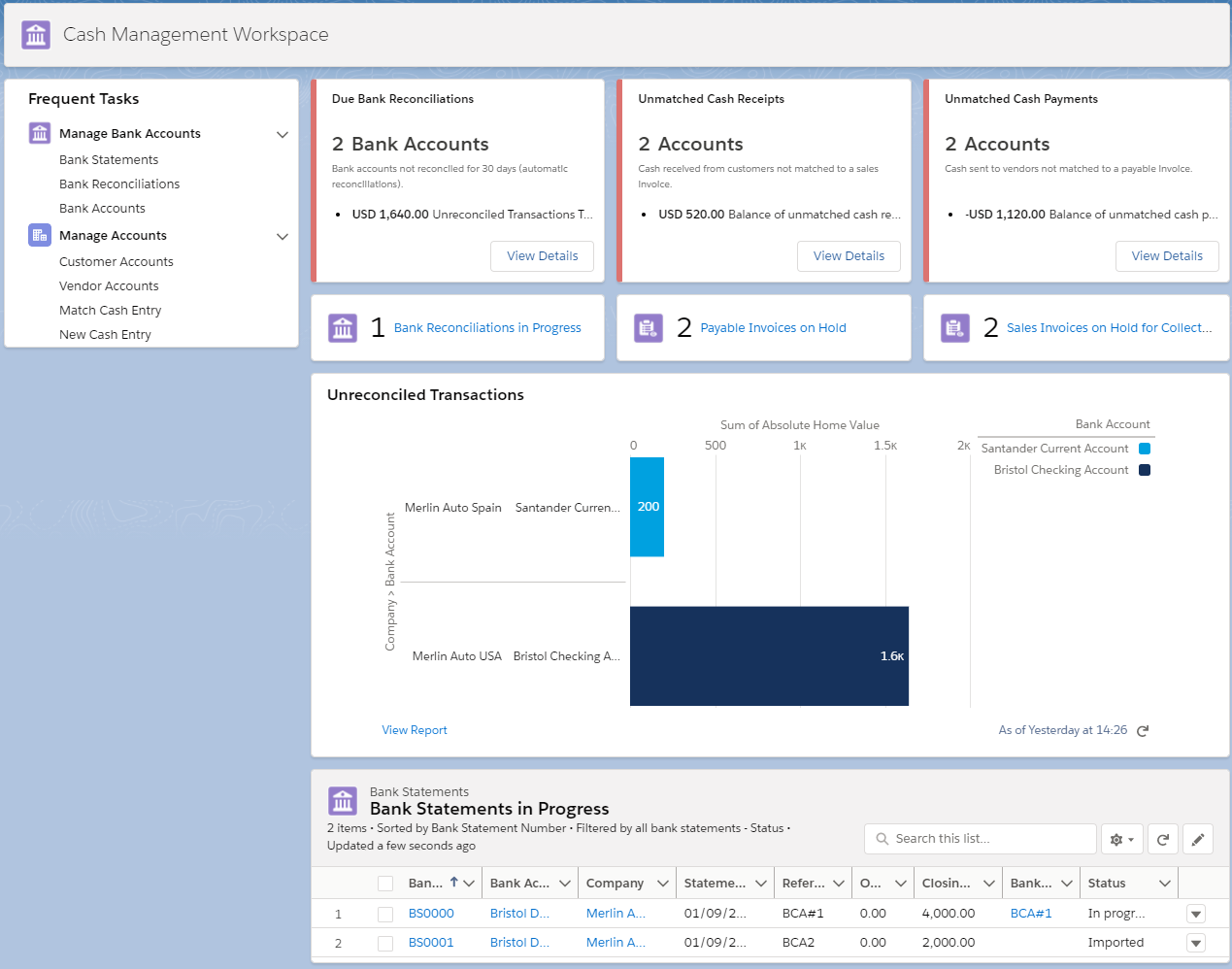 The Cash Management workspace acts as a starting point for the activities that you conduct in your financial controller role. The summary information available is filtered to display only for the selected company.