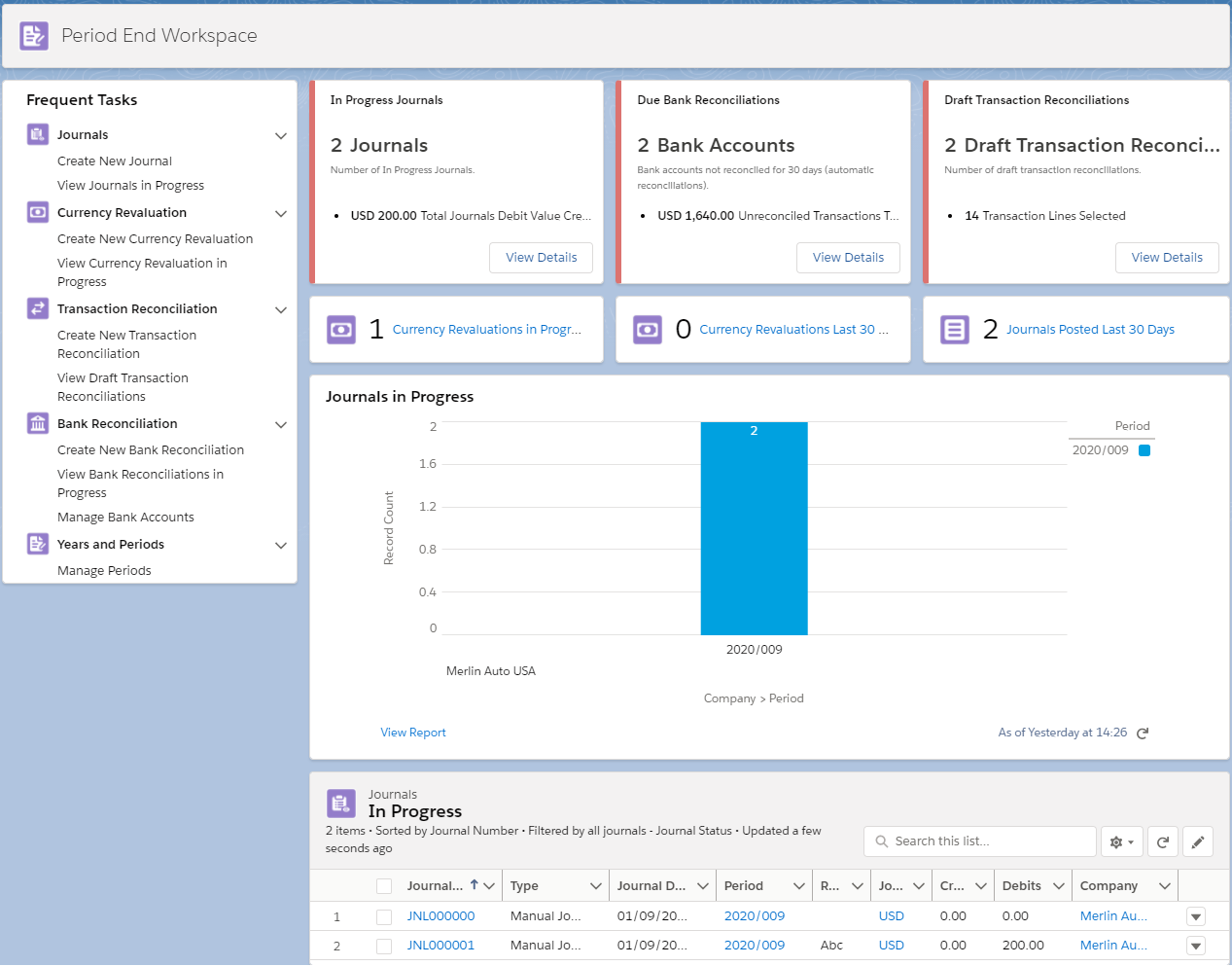 The Period End workspace acts as a starting point for the activities that you conduct in your accountant manager role. The summary information available is filtered to display only for the selected company.