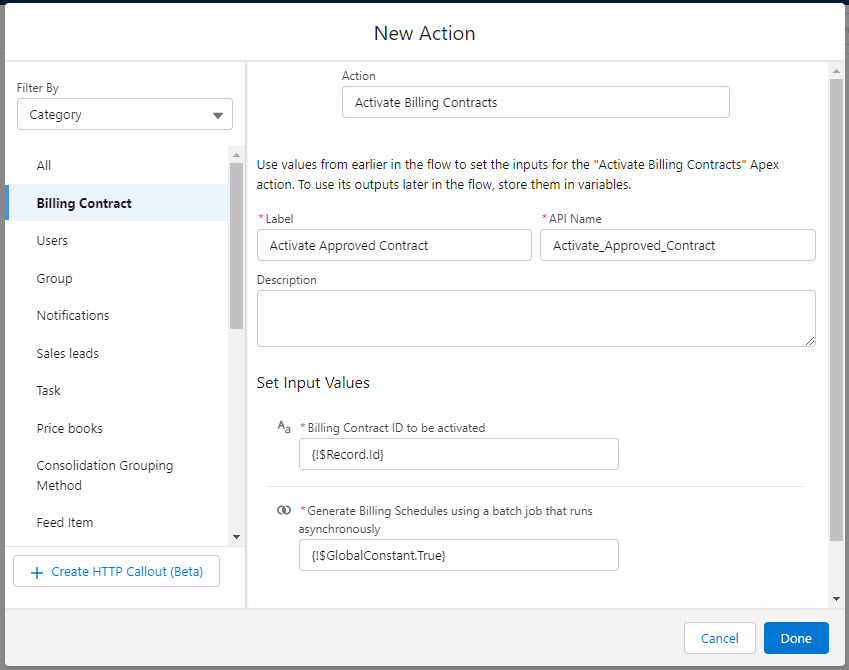 Add an Action element. Choose the Activate Billing Contracts action, then complete the input values.