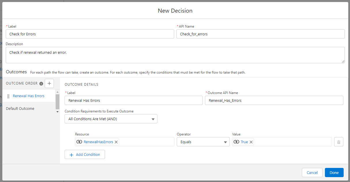 Before the final End element, add a Decision element to check for errors. Create a Renewal Has Errors outcome for if the Apex action returns an error. The condition for this outcome is:
