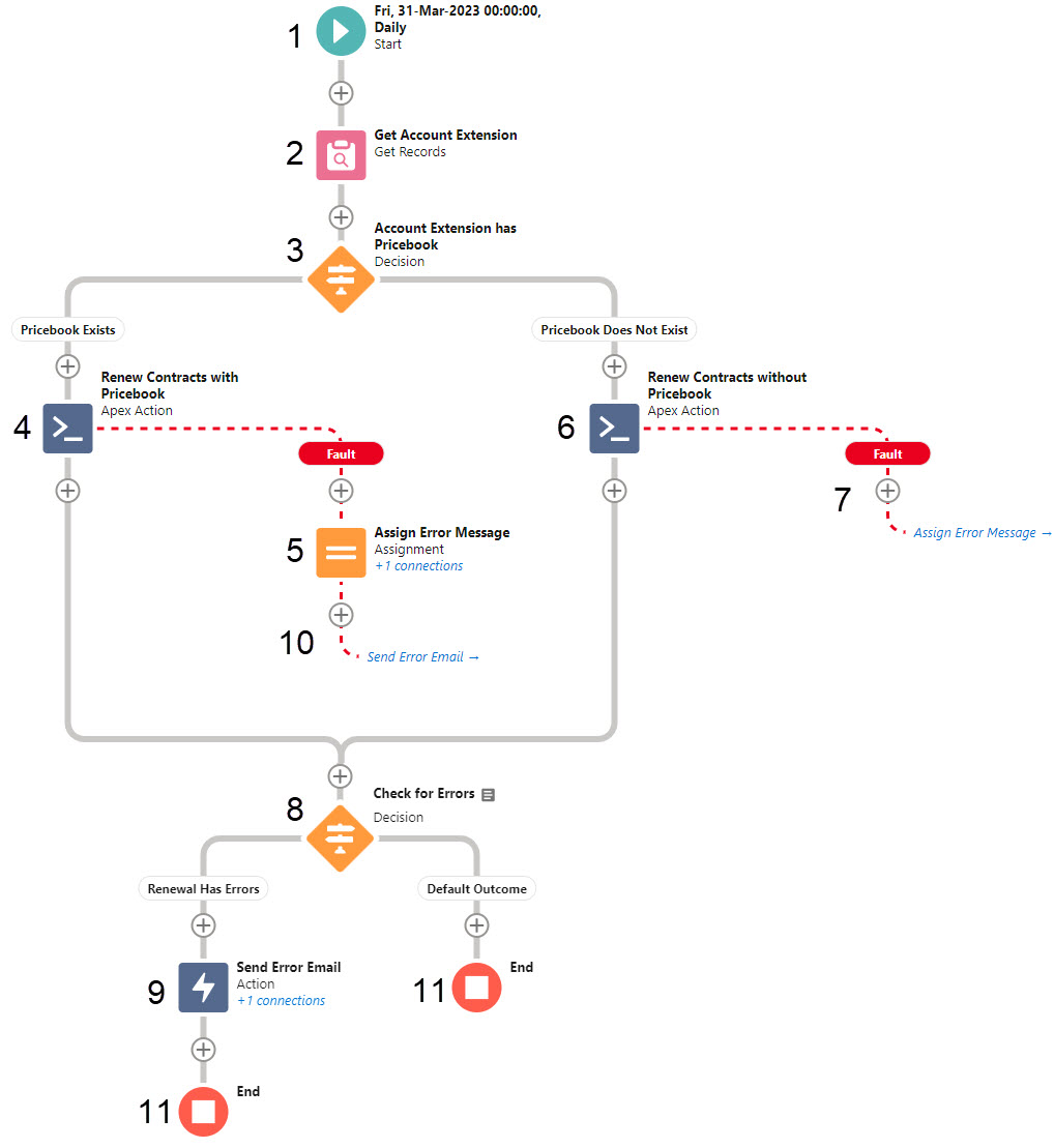This page describes a sample flow to renew contracts automatically using input values derived from fields on account extension records. By creating custom fields on the Account Extension object, you can specify renewal options by account. For example, some accounts might want renewal prices to be derived from a price book, whereas other accounts might want renewal prices to be calculated from a percentage.