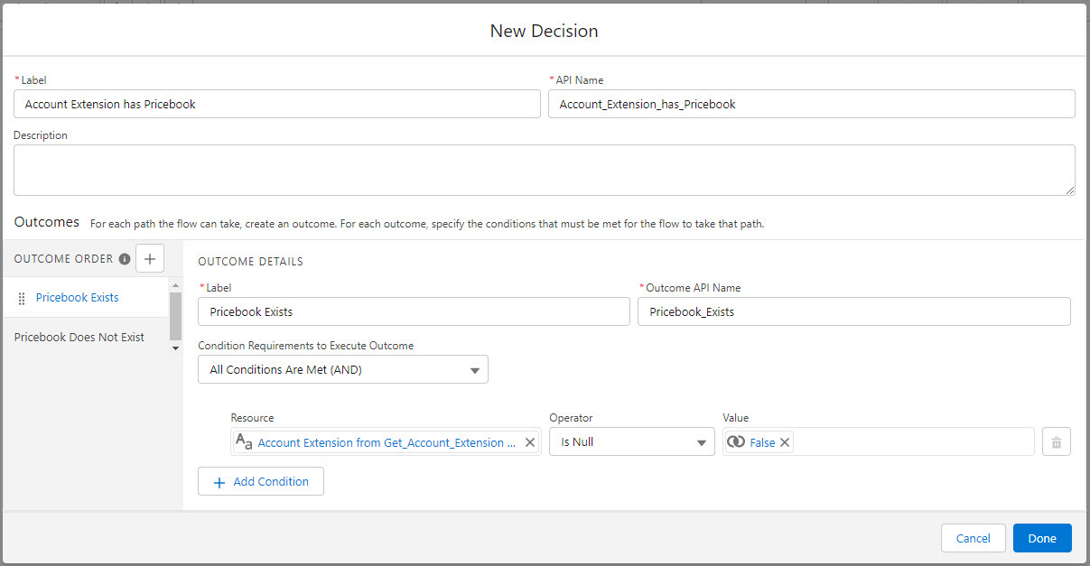 Add a Decision element to check if a price book is supplied. Rename the default outcome to Pricebook Does Not Exist then