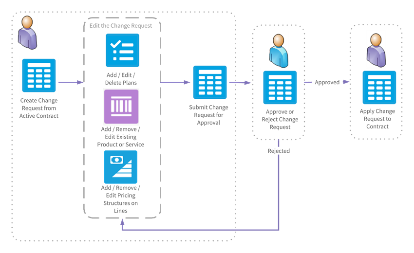 The diagram that follows shows a sample workflow for creating a change request from an active contract and applying it.