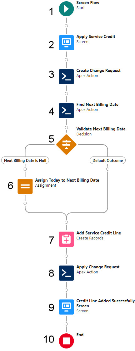 This sample flow is a Screen Flow where the user enters a contract's service credit information via a screen. Billing Central then creates a change request for the service credit line, calculates the next billing date for the service credit line, then applies the change request to the active contract.