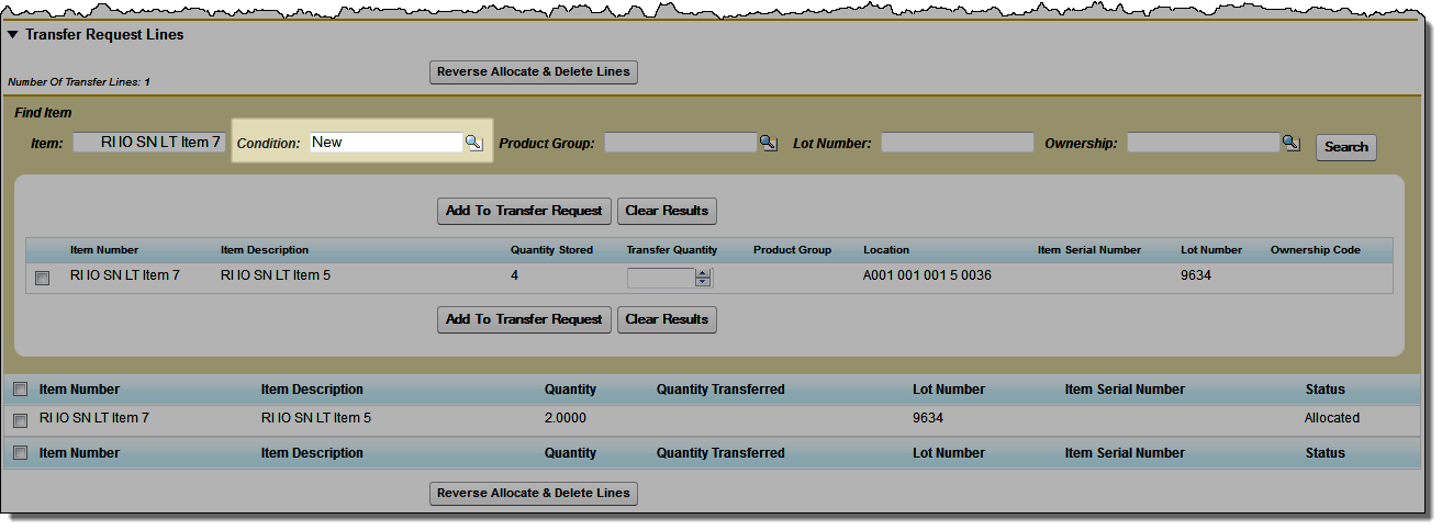If a transfer of an item from one warehouse to another is initiated, a transfer request record is created. You can also create a transfer request to initiate the transfer and change the ownership of items at that inventory position.