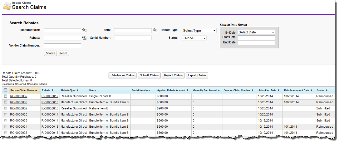 Rebate claims are used to record and track claims that you send to the manufacturer for reimbursement. These are used for Reseller Submitted rebates. Rebate claims are created when all items on a sales order are shipped. You can track Rebate claims on the Rebate Claims tab. The columns shown on this tab are determined by the fields that your administrator has chosen in the Rebate Claims UI field set in the Rebate Claims object.