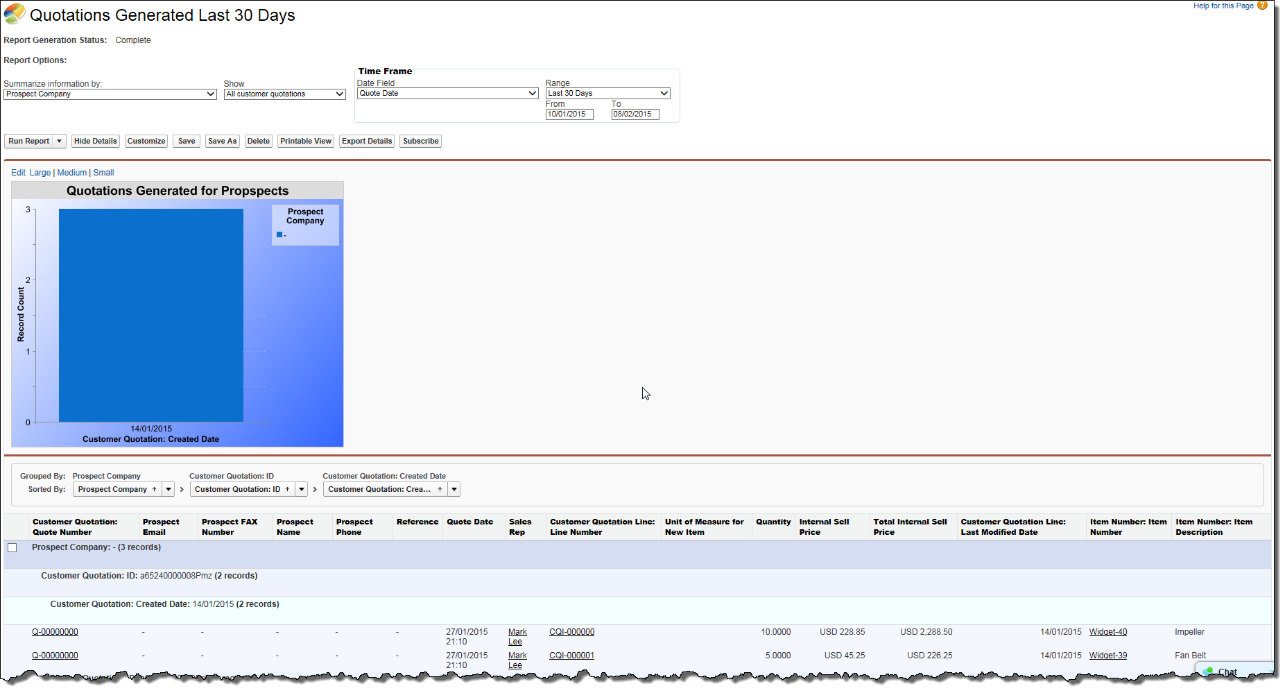 The Quotations Generated Last 30 Days Report shows the details of customer quotations created in the last 30 days.