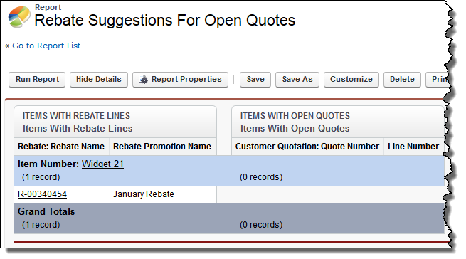 The Rebate Suggestions for Open Quotes report shows items that have rebates and open customer quotations. This enables you to determine whether open quotes are eligible for rebates.