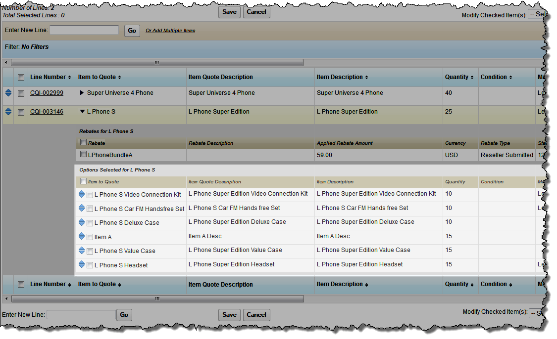 Your administrator may have configured Advanced Quoting to display option fields that show the effects of the options on the price of the quote. The fields that appear depend on the fields that your system administrator has chosen in the Customer Quotation Line Field Sets.