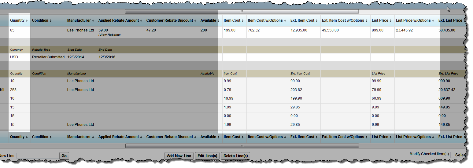 Fields that are prefixed with Ext represent an amount based on the quantity of the item. For instance, in this example, the main Item Cost is 199 and the line specifies a quantity of 65, therefore to get the Ext. Item Cost, the Item Cost is multiplied by 65 to get 12,935.