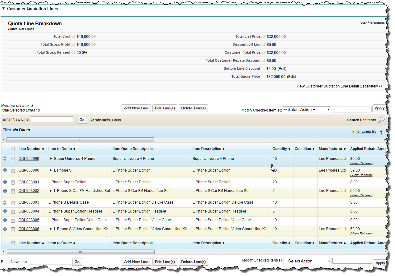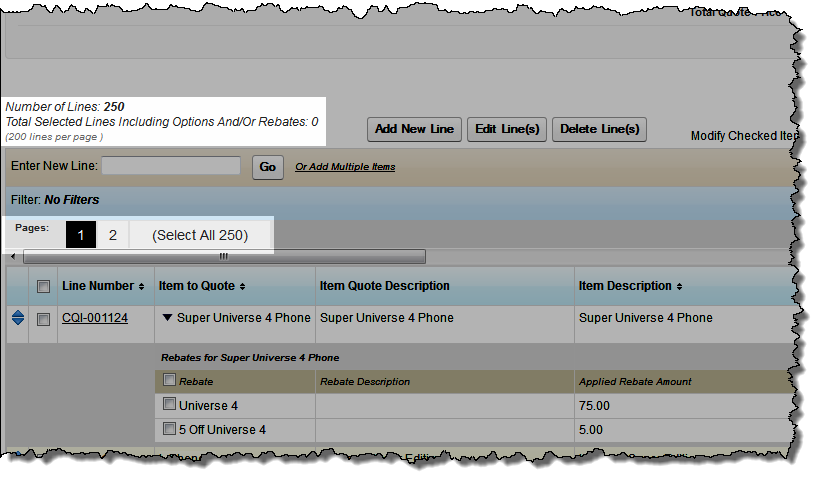 The maximum number of customer quotation lines that is displayed at a time is determined by the option your administrator has chosen in the Number of Lines custom field of the Advanced Quoting Settings custom setting. See Lines Per Page. When there are more than the specified number of lines, these are displayed on additional pages. To view a page, click the page number of the page that you want to view.
