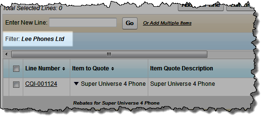 When you collapse the filter box, the selections that you have chosen remain and the customer quotation lines remain filtered. If you want to remove the filters, you must redisplay the Filter Lines By area and reset the filter. When a filter is applied, this is indicated on the customer quotation.
