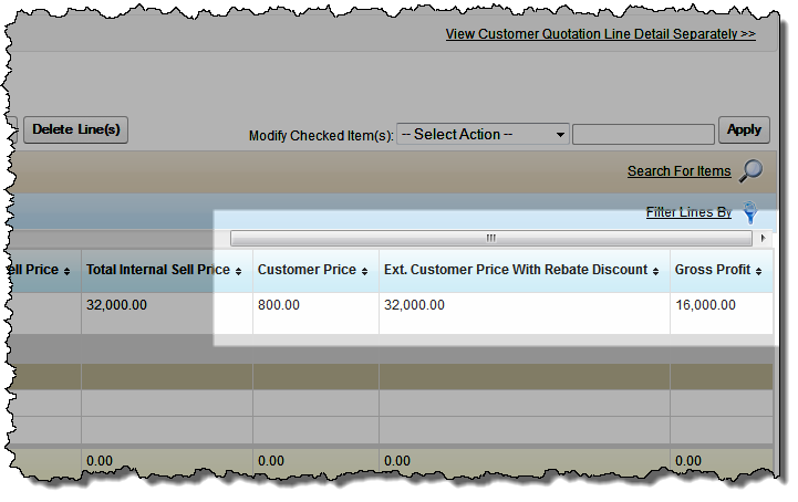 When Advanced Quoting is installed on your organization, customer quotation lines are shown in an enhanced user interface within each customer quotation.