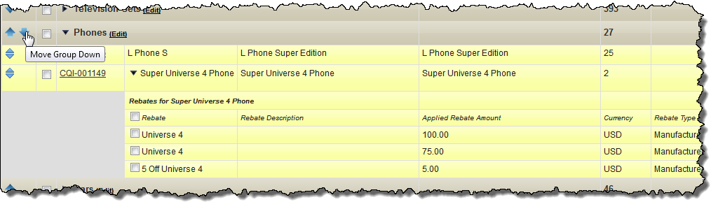 You can group lines together to help categorize subsections of a customer quotation. Grouped lines appear on the customer quotation PDF that is sent to the customer. Once you have grouped the lines you can expand or collapse the groups or change the order in which they are displayed.